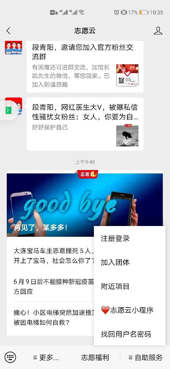 2.手机扫描二维码,关注“志愿云”公众号,点击“自助服务—注册登录—志愿者注册”,填写个人信息注册。